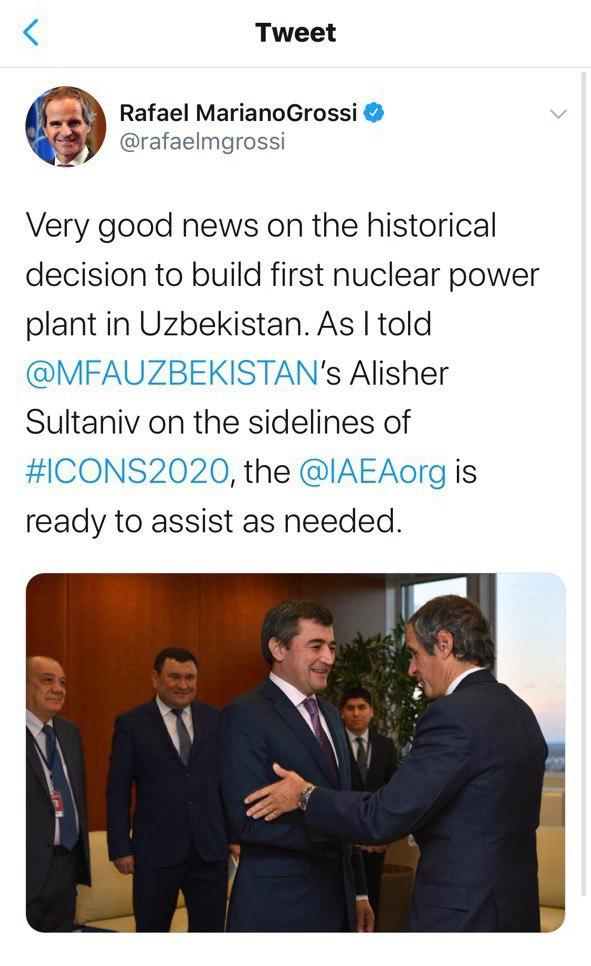 Делегация Узбекистана во главе с министром энергетики Алишером Султановым принимает участие в Международной конференции по физической ядерной безопасности, проходящей 10–14 февраля 2020 года в штаб-квартире организации в Вене. В рамках форума состоялась встреча членов делегации с вновь назначенным генеральным директором МАГАТЭ Рафаэлем Мариано Гросси.